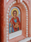 Храмовый образ на западном фасаде Пантелеимоновской церкви при епархиальном управлении Удмуртской епархии в Ижевске Удмуртской Республики. |  Пантелеимон Целитель, икона в проходе под церковью Николая Чудотворца в Успенском Псково-Печерском монастыре в Печорах Псковской области. |  Великомученик Пантелеимон, икона в интерьере церкви Георгия Победоносца в Дедовске городского округа Истра Московской области. |  Пантелеимон Целитель, икона в интерьере церкви Александра Невского в Суземке Брянской области. |  Храмовый образ на западном фасаде церкви Пантелеимона Целителя в Твери. |