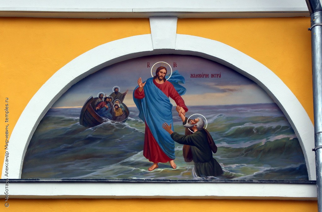 Маловерие Петра, роспись на южном фасаде церкви Покрова Пресвятой Богородицы в Акулово Одинцовского района Московской области. 26 октября 2016 годаФот. Чеботарь Александр Мирчевич