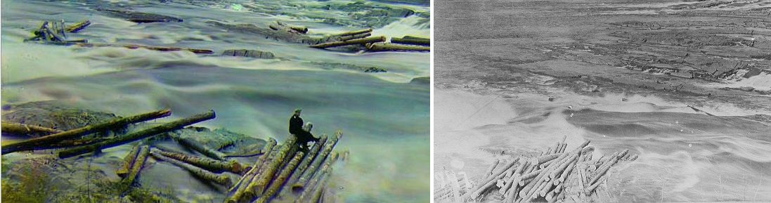 У Прокудина-Горского, напротив, при обилии снимков http://prokudin-gorskiy.ru/tree.php?ID=201 водопад выглядит узким падающим потоком. Возможно, так снималось из-за несовершенства техники съемки, когда при совмещении пластинок во время демонстрации, падающая вода и движущийся поток выглядят неопределенной белой массой без контуров и движения.