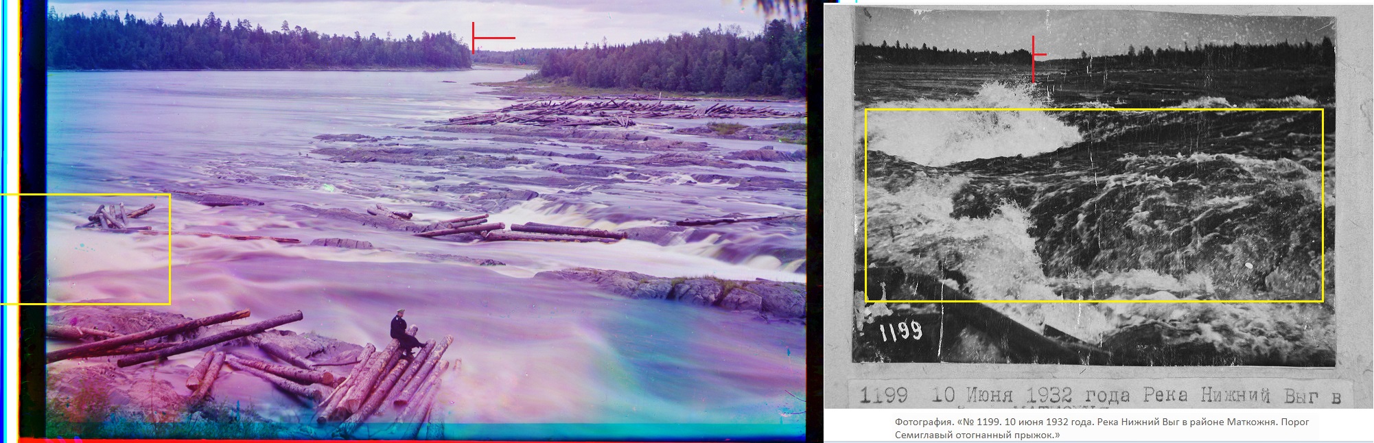 Вячеслав нашел на Госкаталоге этот снимок «10 июня 1932 года. Река Выг в районе Маткожни. Вид порогов «Семиглавый» вверх по течению.»