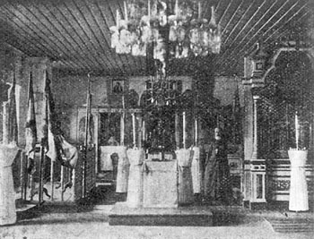 Зданием - каменная, без колокольни; колокола же помещаются в Арке-Тверда. Построена по рисункам и плану архитектора Тона, бывшего Ректора Императорской Академии Художеств. Престол вначале был один, во имя Свв. Апостолов Петра и Павла, а в 1890 г. устроен придел "в память Вознесения Господня", - причем в церкви тогда же был поставлен новый иконостас с новыми иконами, и все заново реставрировано. Из приношений членами Императорского Двора хранятся при полковой церкви в отдельных витринах: 1) собственноручной Ее Императорского Величества Государыни Императрицы Александры Феодоровны работы, шитые шелковым гарусом - воздухи, принесенные в дар полковой церкви в мае 1897 года, 2) облачения священнические, диаконские и псаломщические из дорогой парчи, принесенные в дар полковой церкви к столетнему юбилею полка в 1903 г. Шефом полка, Ее Величеством, ----- <84/85> ----- 3) крест из горного хрусталя, украшенный аметистами - дар полковой церкви 10 августа 1898 года от Его Императорского Высочества Евгения Максимилиановича Романовского, герцога Лейхтенбергского, 4) мундиры в Бозе почивших Императоров: Николая I, Александра II и Александра III и Великого князя Николая Николаевича - Шефа полка, и того же Великого князя - сабля, украшенная бриллиантами за войну 1877-78 г.г. Под спудом храма покоится прах умершего генерала Струкова. С 1907 г. при полку имеется, в лагерном расположении, под Красным Селом, близ деревни Куттузи, церковь во имя Великомученика Иоанна Воина; освящена в присутствии Государя Императора Николая II 1907 года июня 24 дня. Зданием деревянная, в древнерусском стиле, с колокольней. Построена по рисункам и плану художника-архитектора Павлова, утвержденных Августейшим Шефом полка, причем все устройство лагерной церкви исполнялось по желанию и личному указанию Ее Величества, под наблюдением князя Путятина. По штату при церкви положены: два священника и псаломщик. Церковь 148-го пехотного Каспийского полка во имя Св. Великомученицы Анастасии. Полковой праздник 22 декабря. 1811 г. Ноября 6. Из двух рот Углицкого пехотного, трех Московского, двух Архангелогородского и одной Казанского гарнизонных полков сформирован, в составе 3-х батальонов, Одесский пех. полк. 1863 г. Октября 13. Из 4-го резервного батальона и бессрочно- отпускных 5-го и 6-го батальонов Одесского пехотного полка сформирован 2-х батальонный Каспийский пехотный полк. 1864 г. Марта 25. Назван 148-м пехотным Каспийским. Походная (при полку) церковь учреждена в 1864 году. Церковь эта сопутствовала полку в походе Русско-Японской войны 1904-1905 г.г. Находится церковь на окраине города Н.-Петергофа, рядом с вокзалом станции. Вокруг поля и парки. Церковь заложена Государем Императором Николаем Александровичем 30 июня 1901 года и освящена О. Протопресвитером военного и морского духовенства А. А. Желобовским в присутствии Их Величеств 5 июня 1903 года. Выстроена (первая) по типу военных церквей *). Вмещает 900 человек. Ризницею и утварью снабжена очень хорошо. Достойны внимания: 1) образ Спасителя - благословение Их Величеств при уходе полка в поход в 1904 году в Манчжурию и 2) икона Божией Матери - благословение полку Государыни Императрицы Марии Феодоровны; обе иконы в серебряных ризах. *) Смотр. 13 стр. - "Тип военной церкви". ----- <85/86> ----- Посвящена церковь памяти Св. Великомученицы Анастасии (22 декабря) в ознаменование рождения Ее Высочества княжн